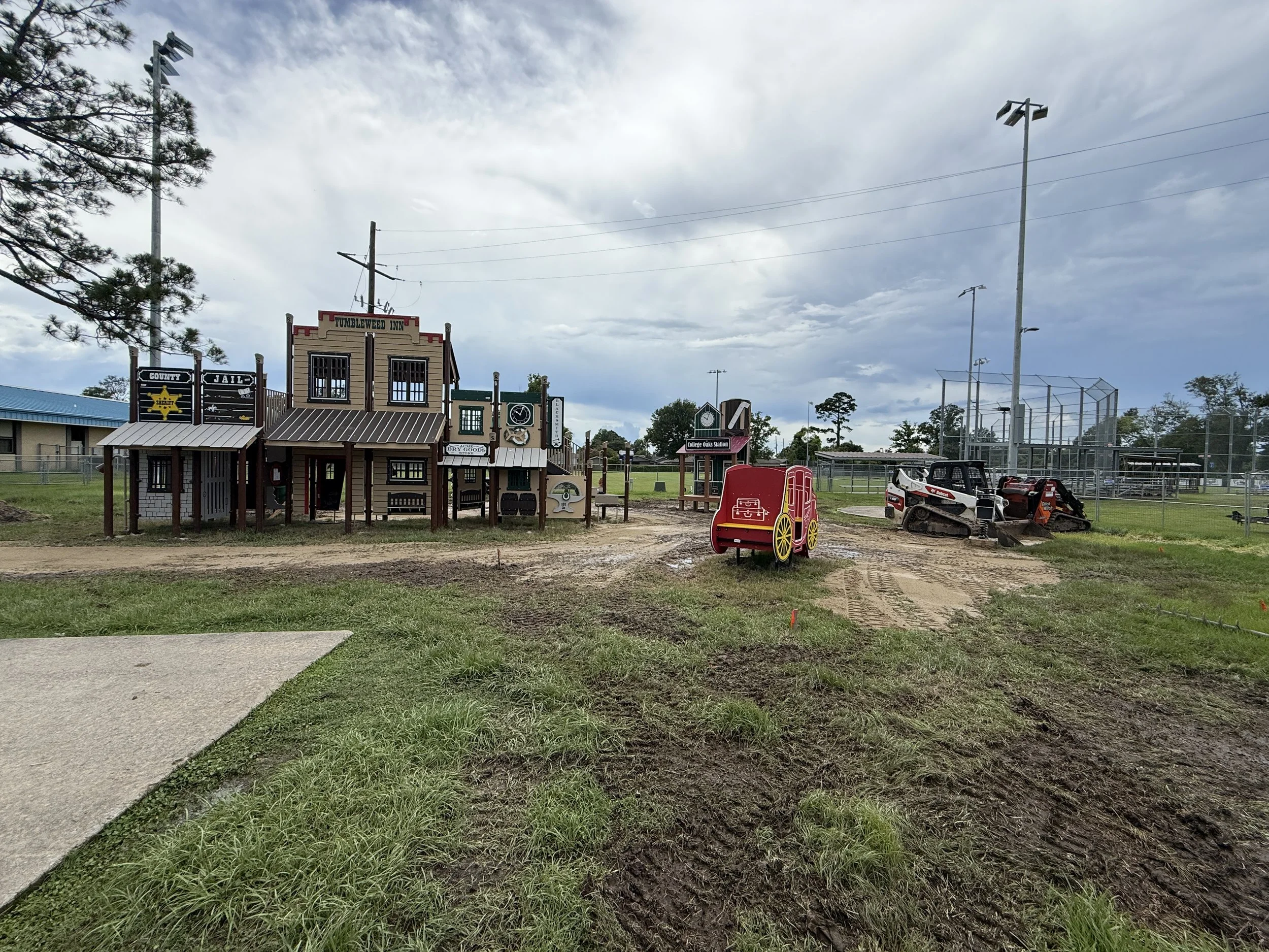 Remove and dispose of old playground equipment and replace with new western themed play sets. Old playground was demolished, graded to drain, and seeded.